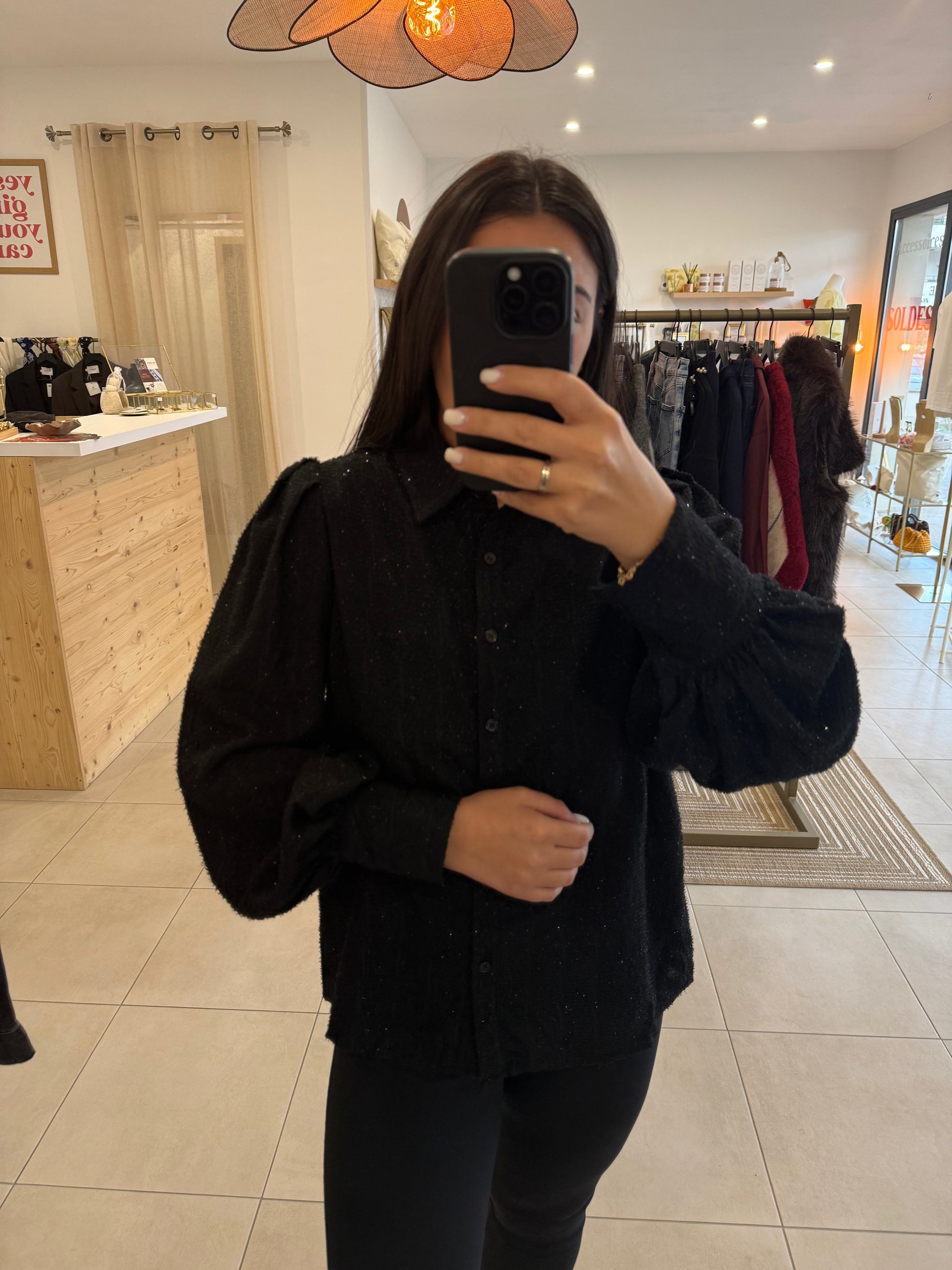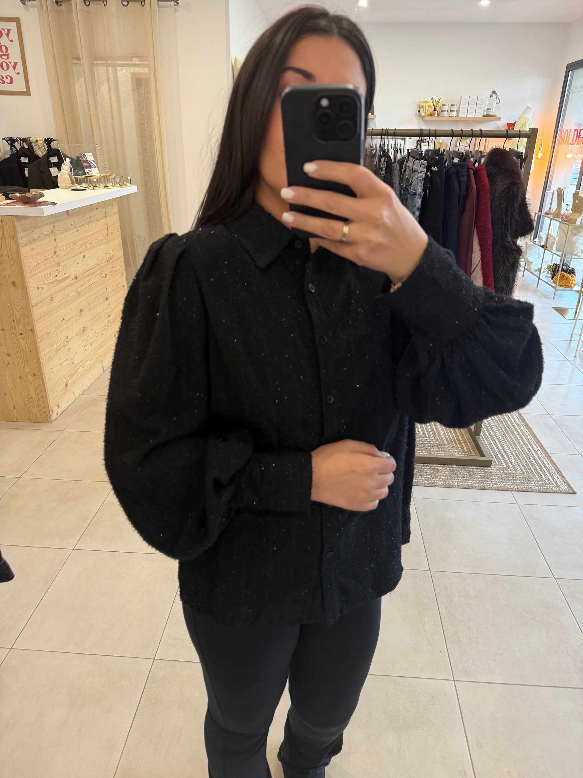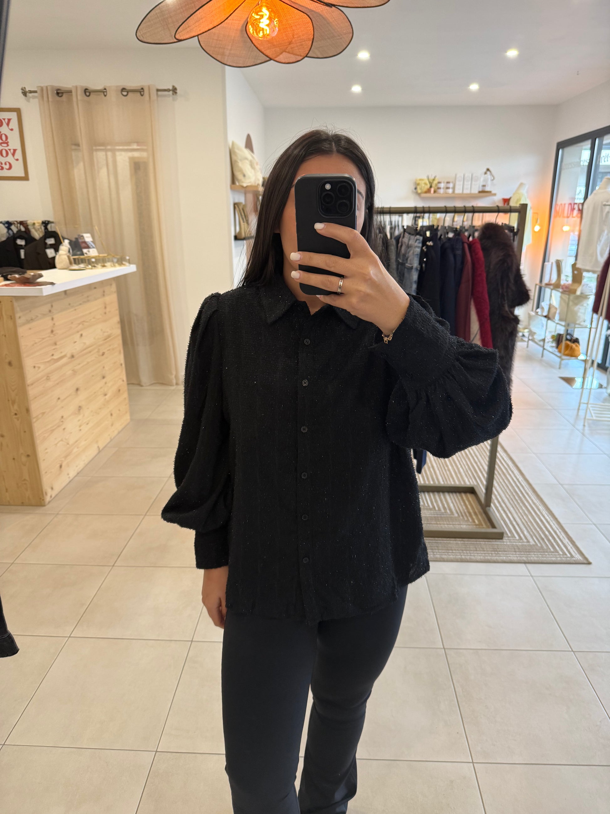 Chemisier noir texturé, doté de manches longues bouffantes pour une touche élégante et féminine.