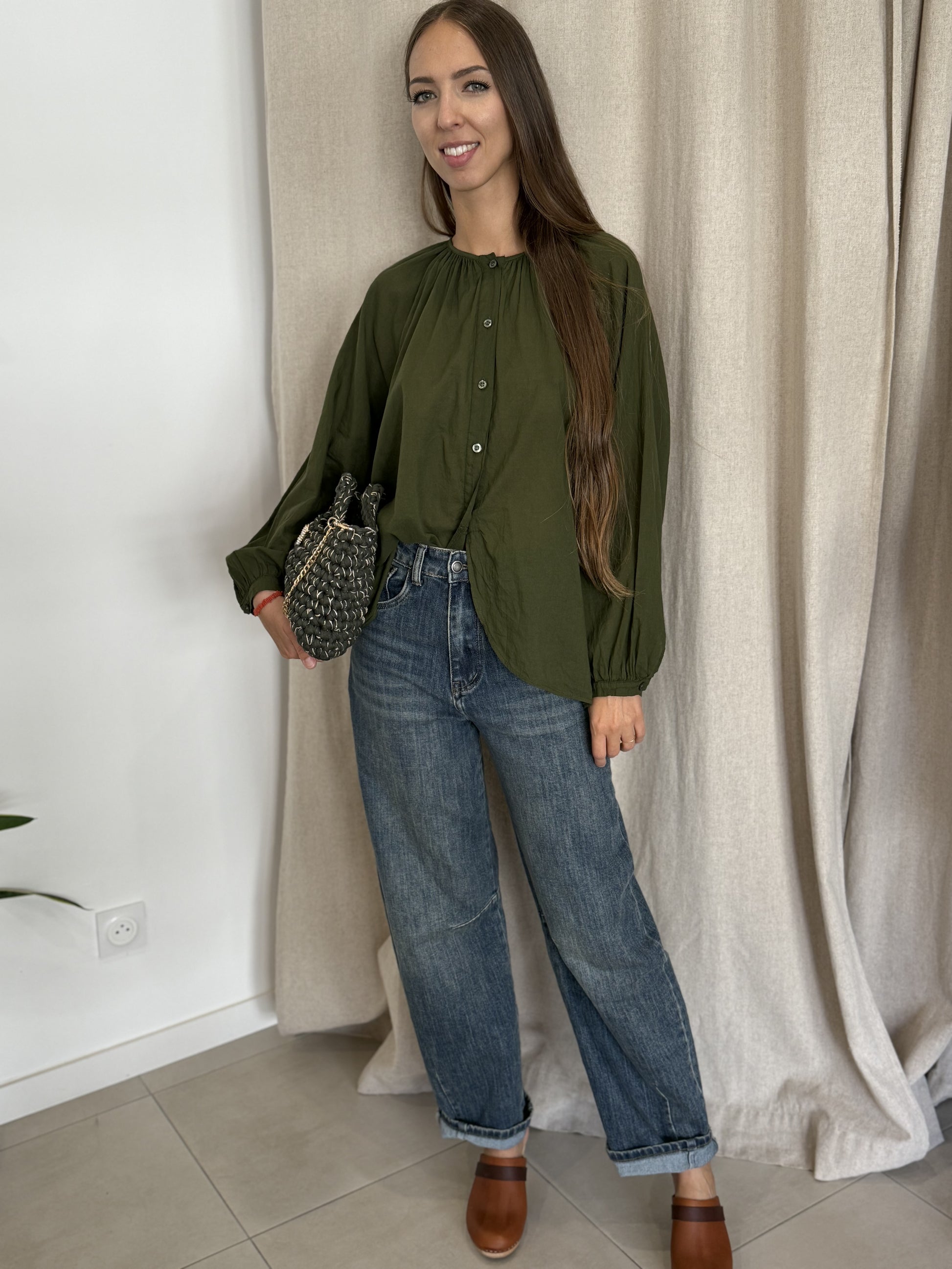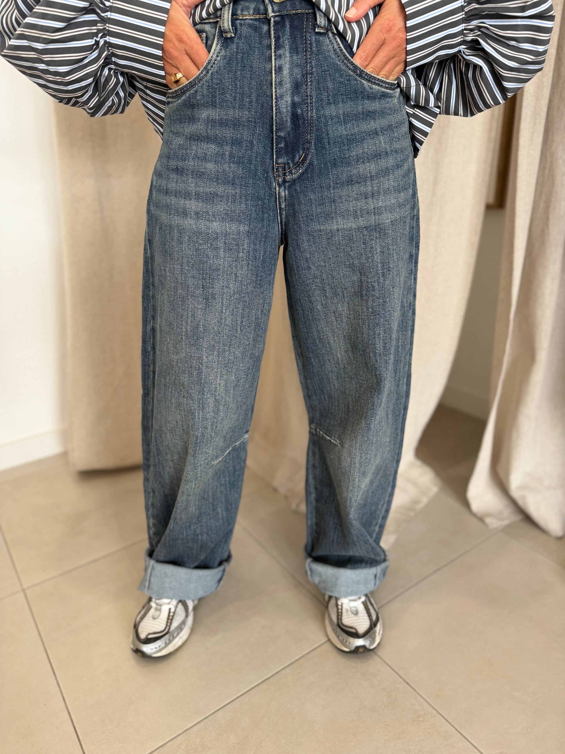 Jean bleu coupe barrel : un denim tendance à la coupe barrel, moderne et décontractée, parfait pour un style pointu et actuel.