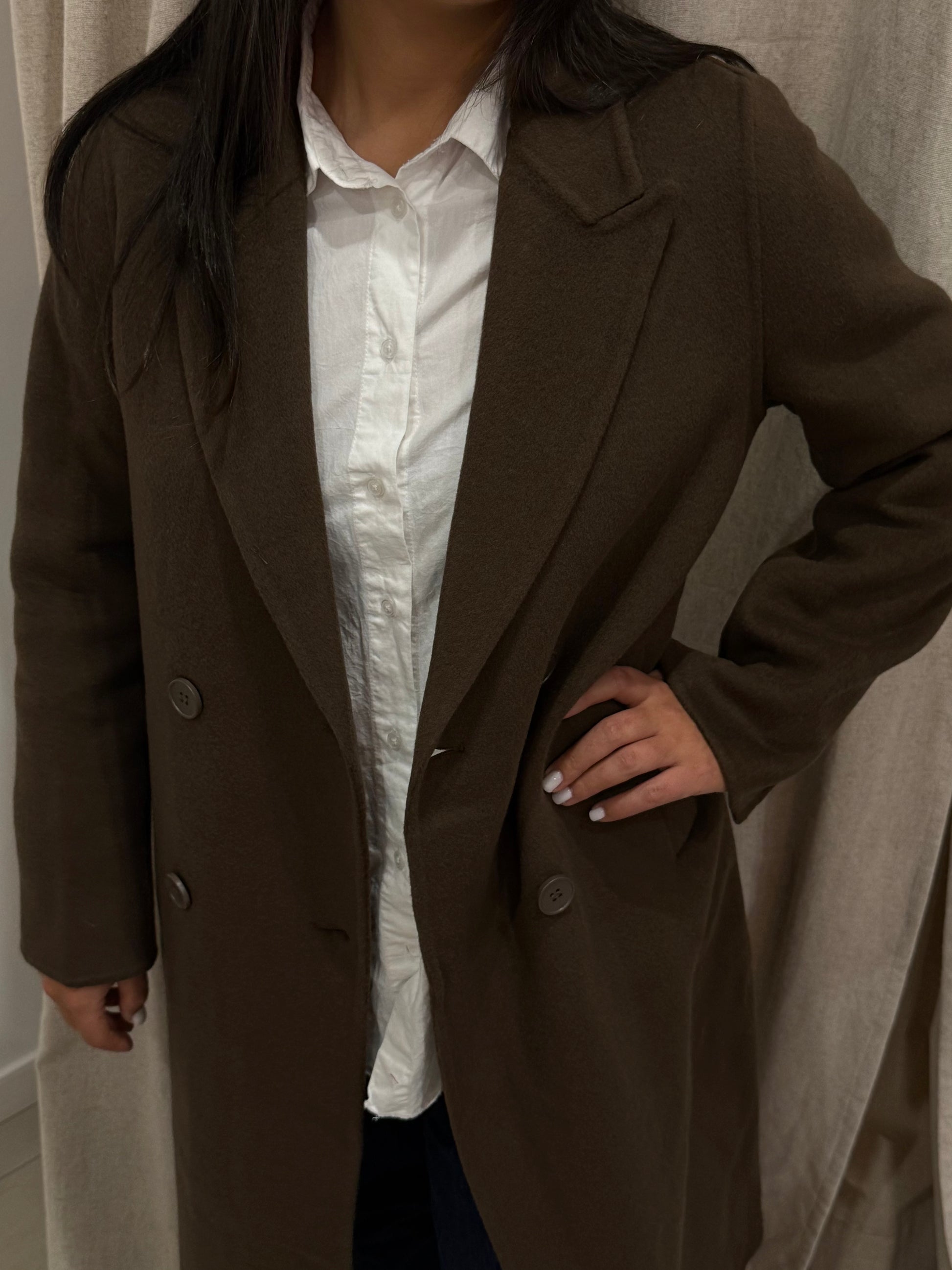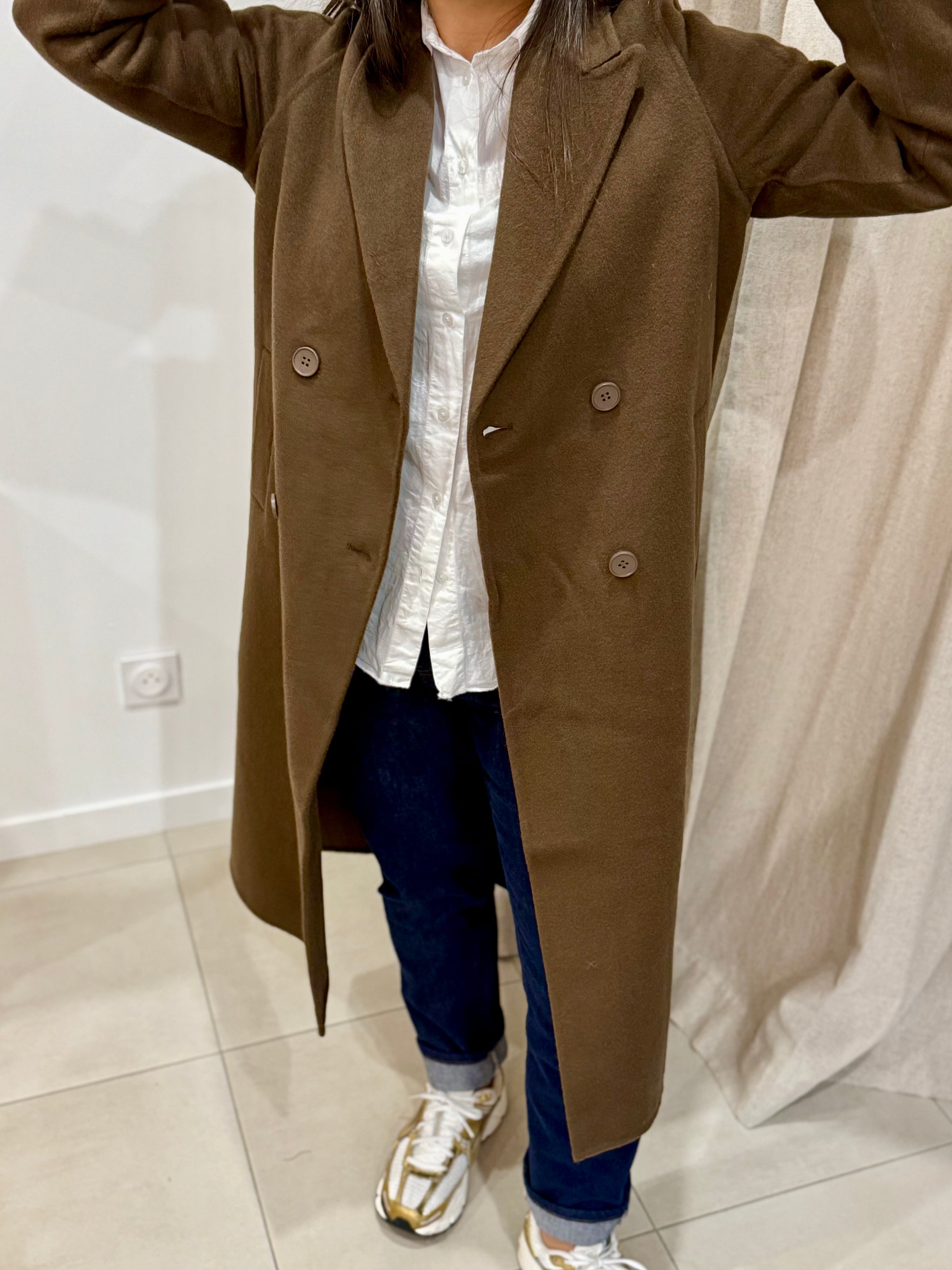 Manteau long double-boutonnage à revers large, conçu dans une matière douce et structurée avec 75% de laine.