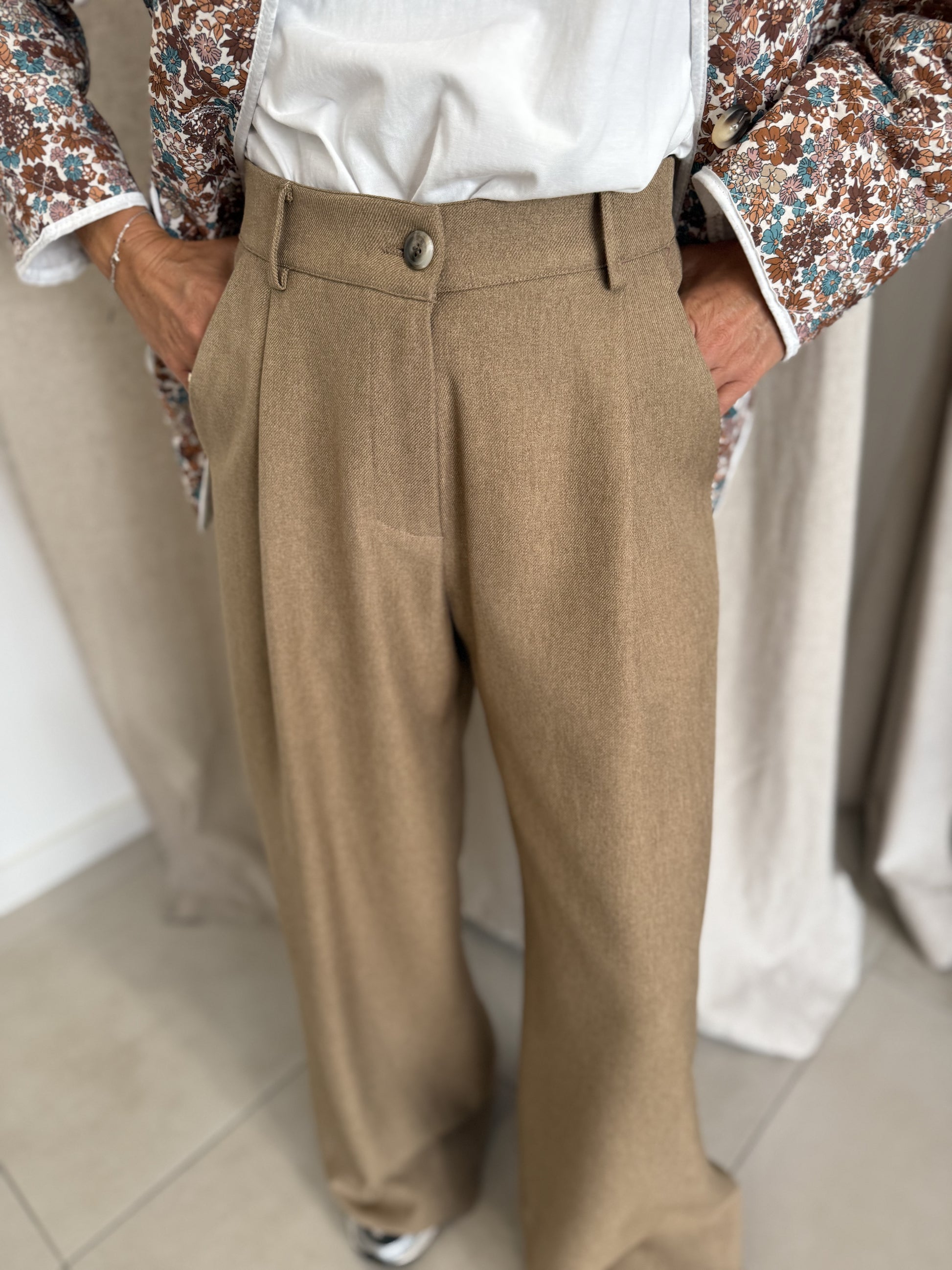 Pantalon large beige à pinces, taille haute élastique au dos avec fermeture boutonnée, coupe fluide et élégante idéale pour un look chic et décontractée.