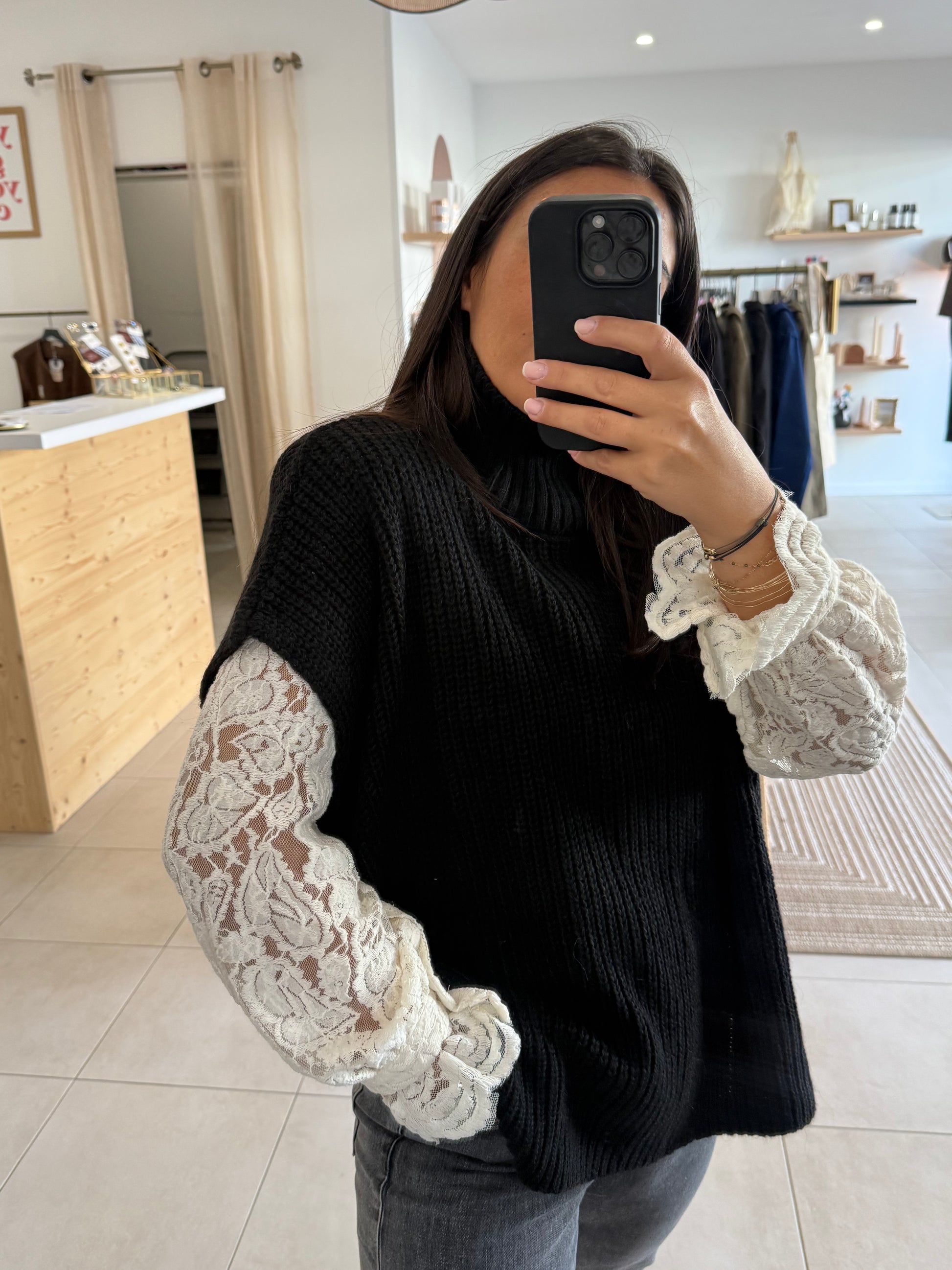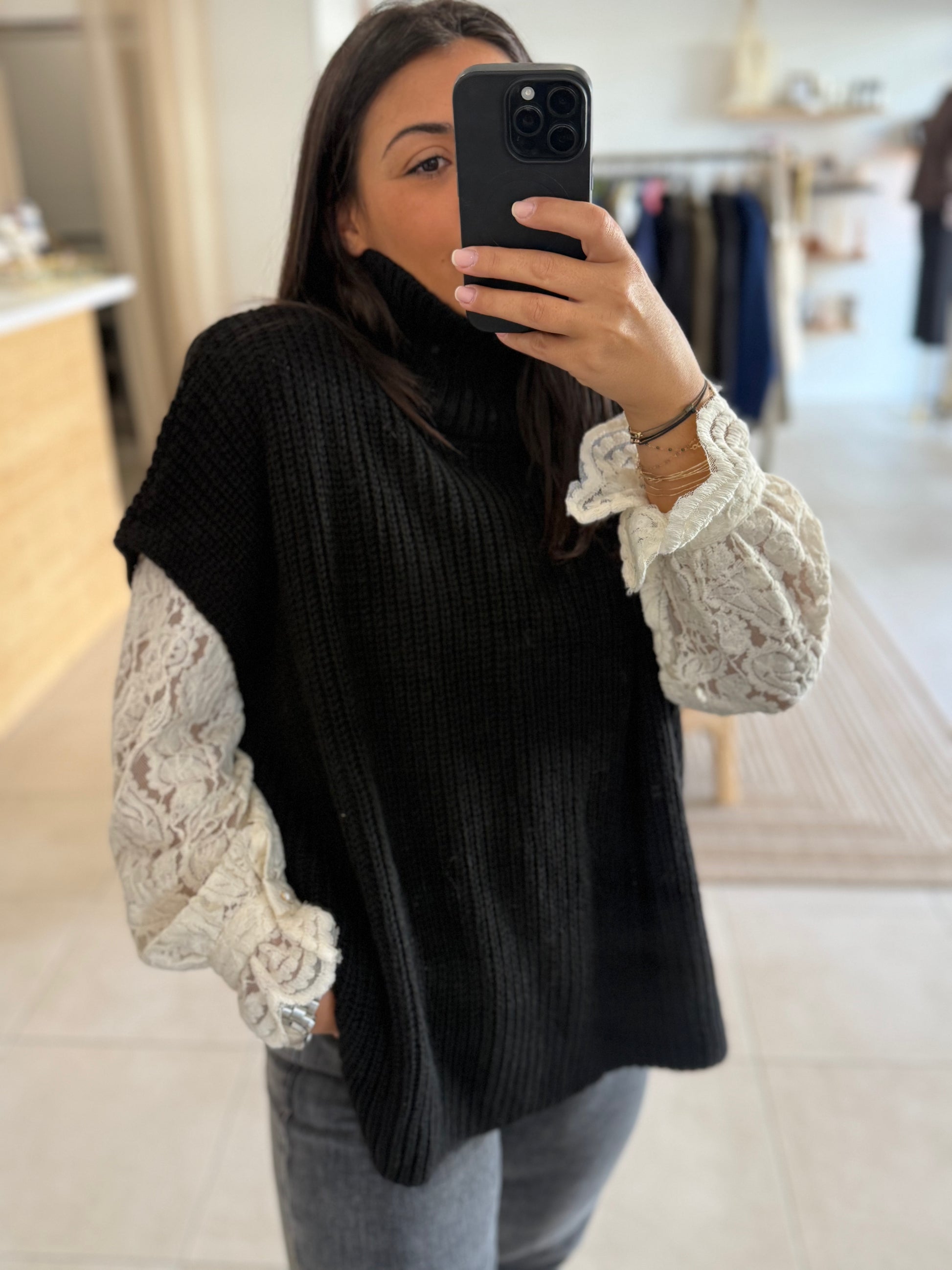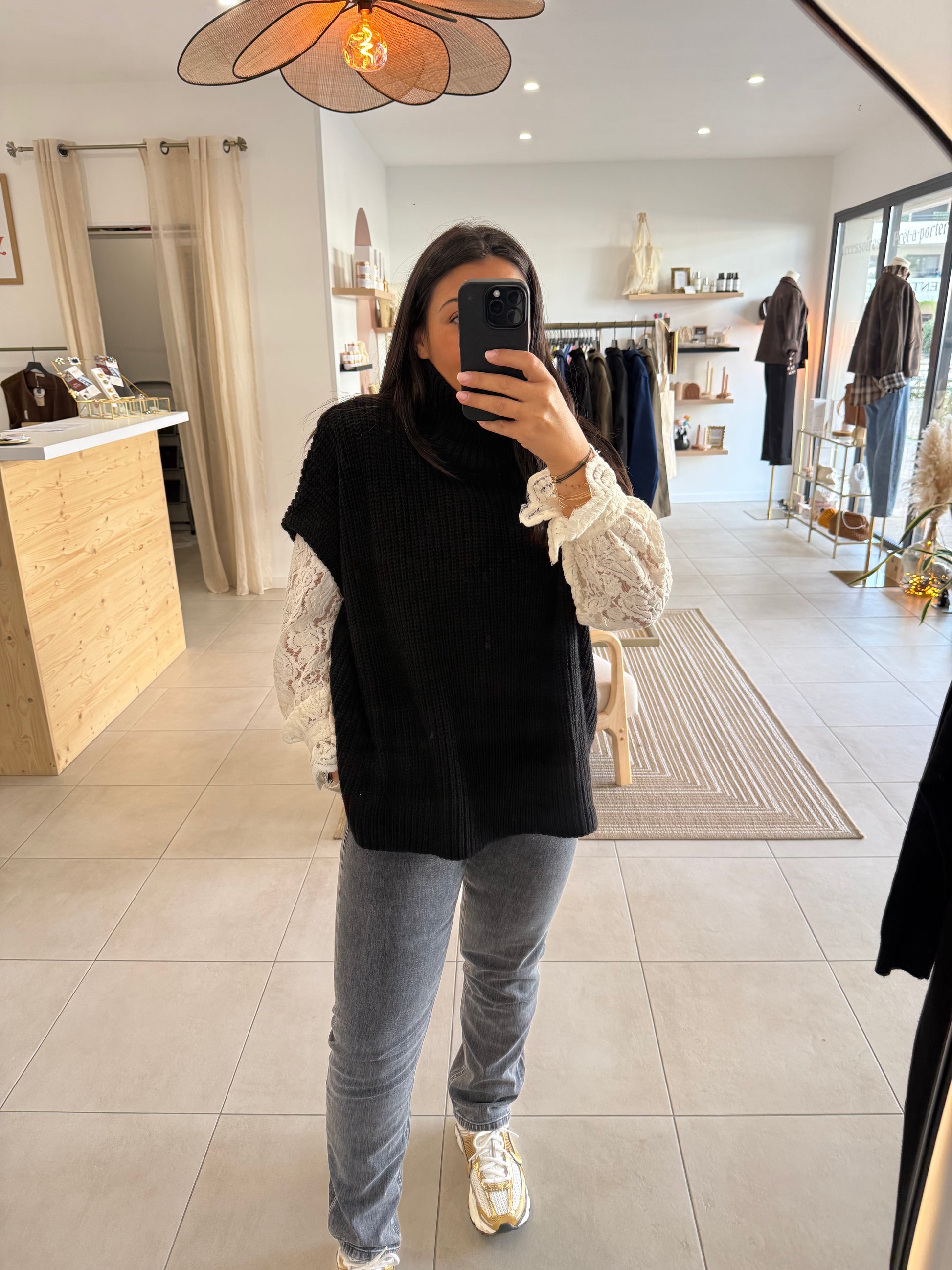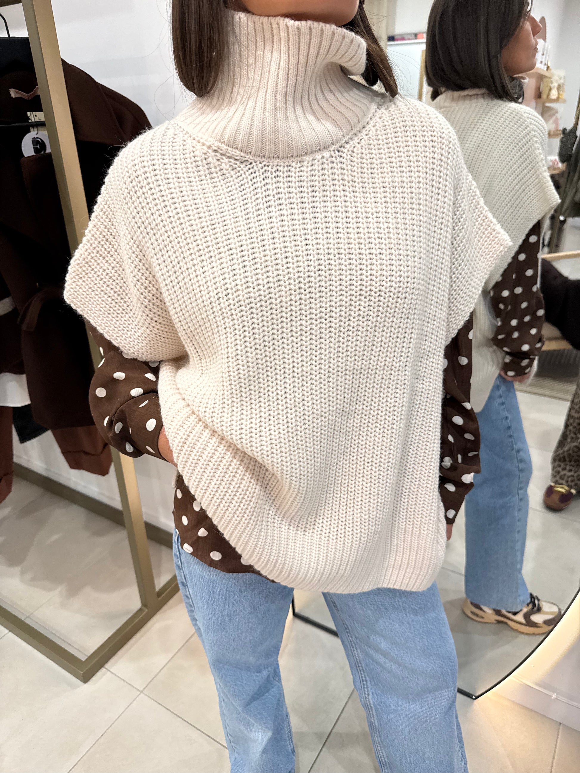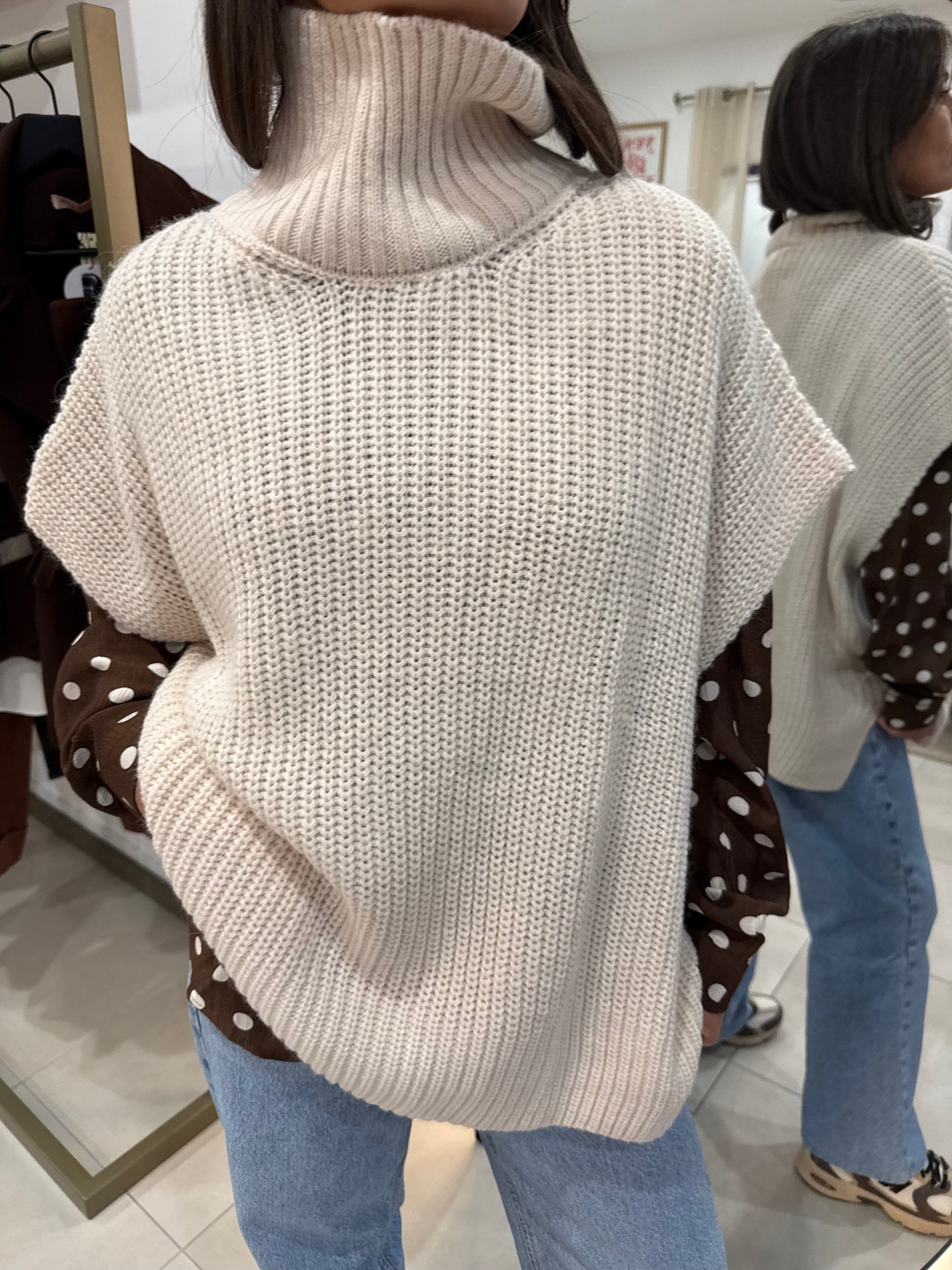 Pull sans manches à col montant, maille épaisse et coupe oversize. Parfait à superposer sur une chemise en dentelle ou un sous pull.