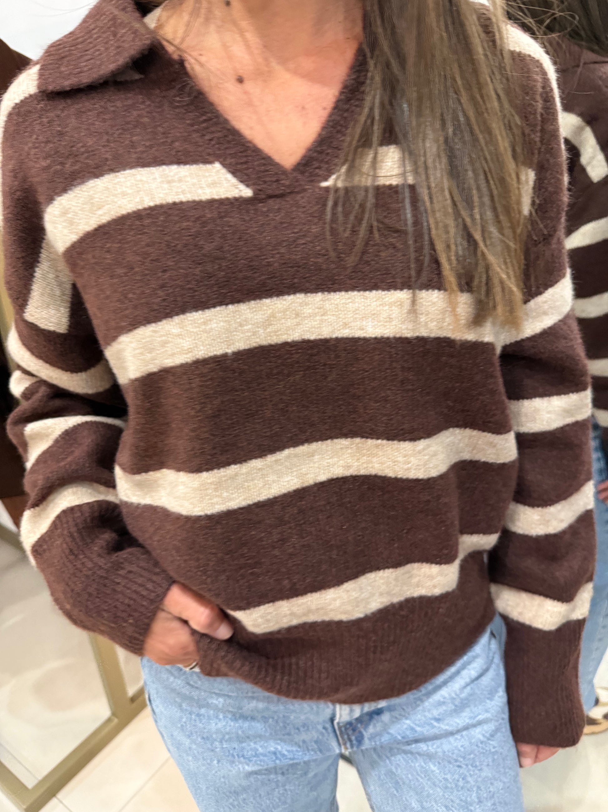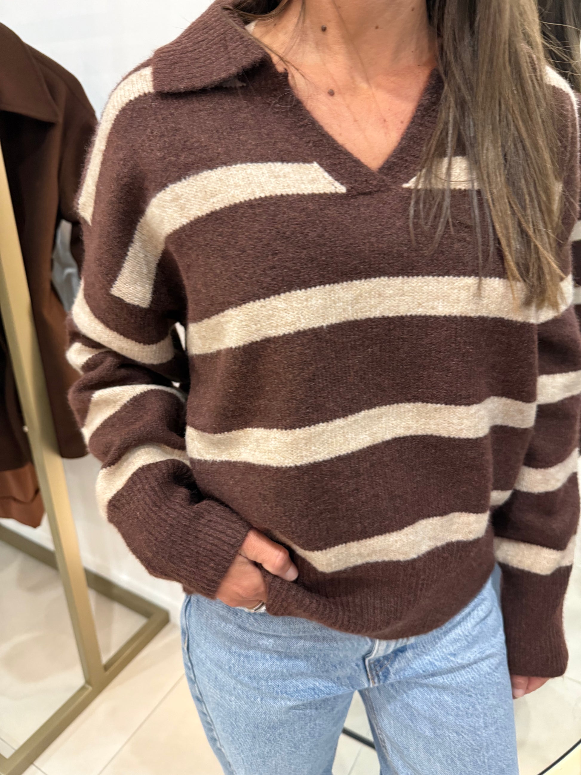 Pull doux à rayures beige et marron, coupe légèrement loose et col polo, pour un look casual chic.