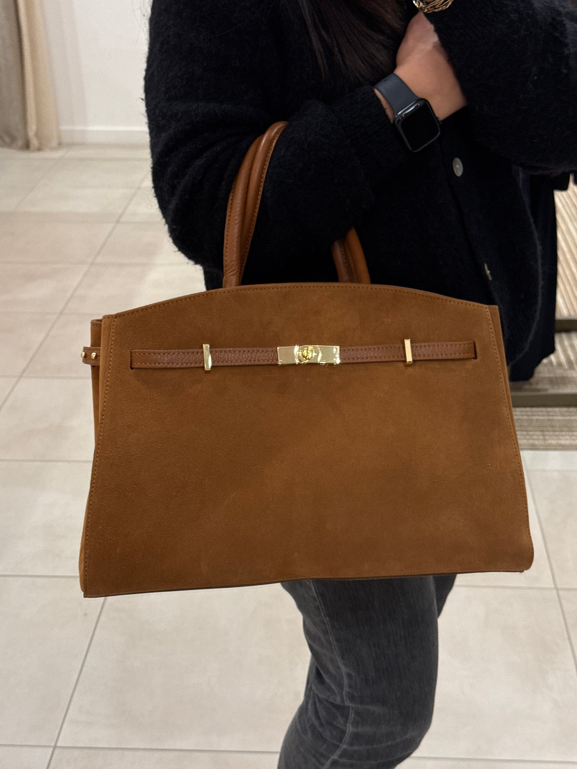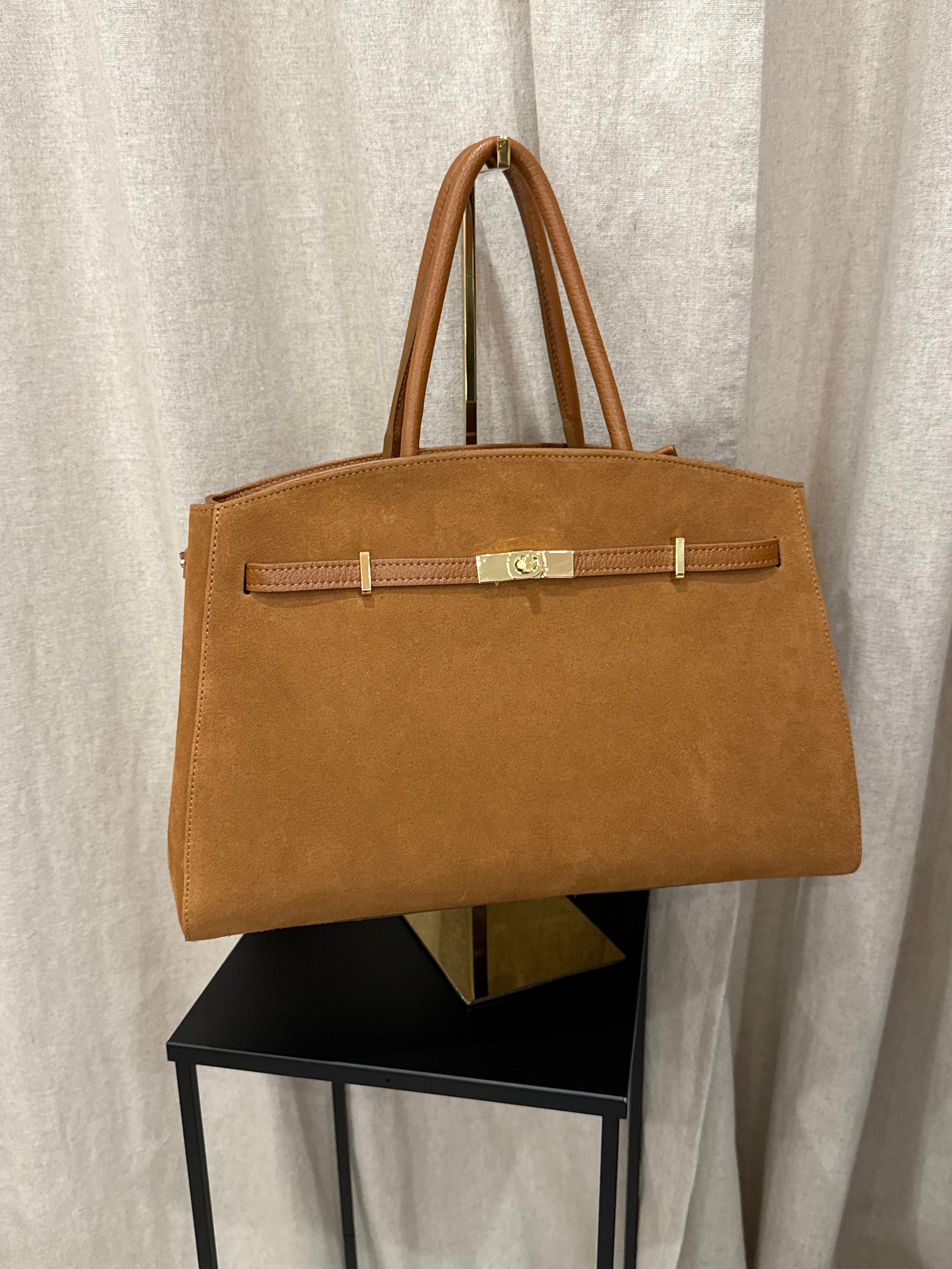 Sac en daim coloris camel, doté d’une fermeture zippée pour une sécurité optimale. Il est équipé d’une bandoulière et d’une anse en cuir lisse.