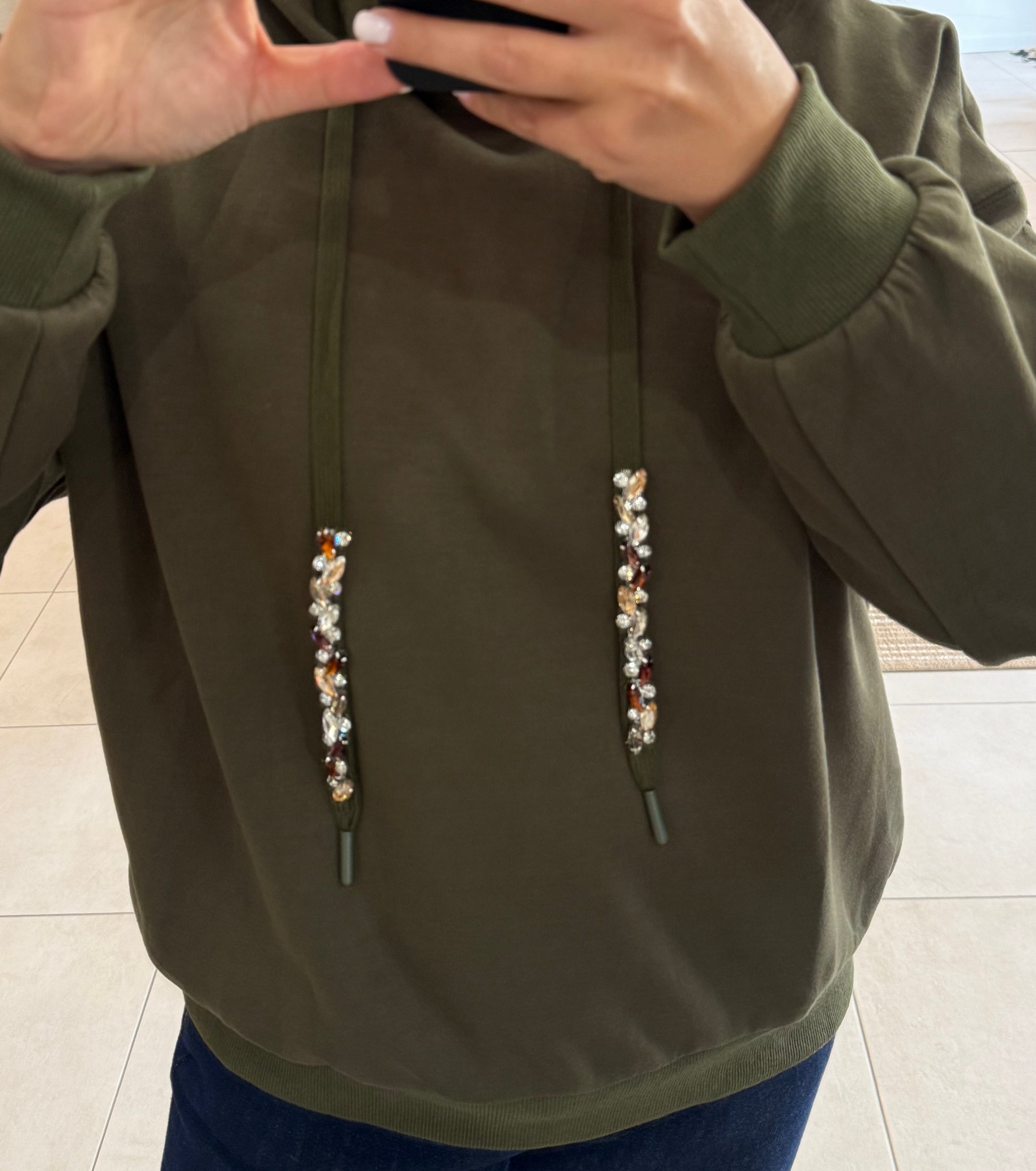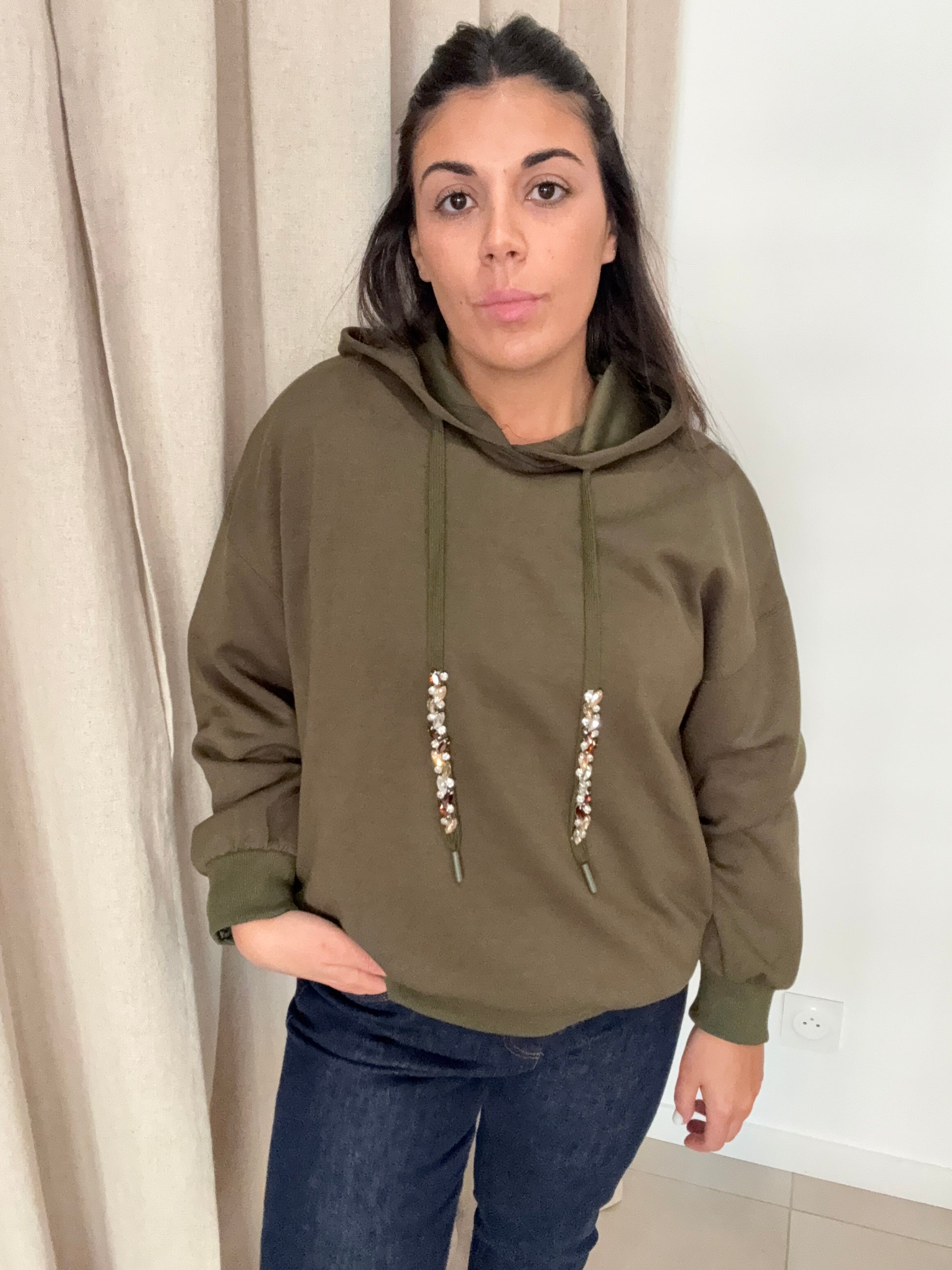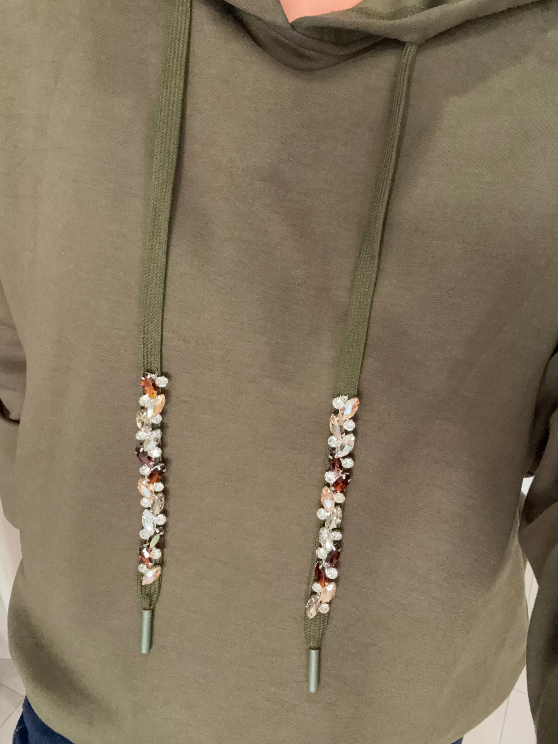 Détails; cordons réglables orné de strass.