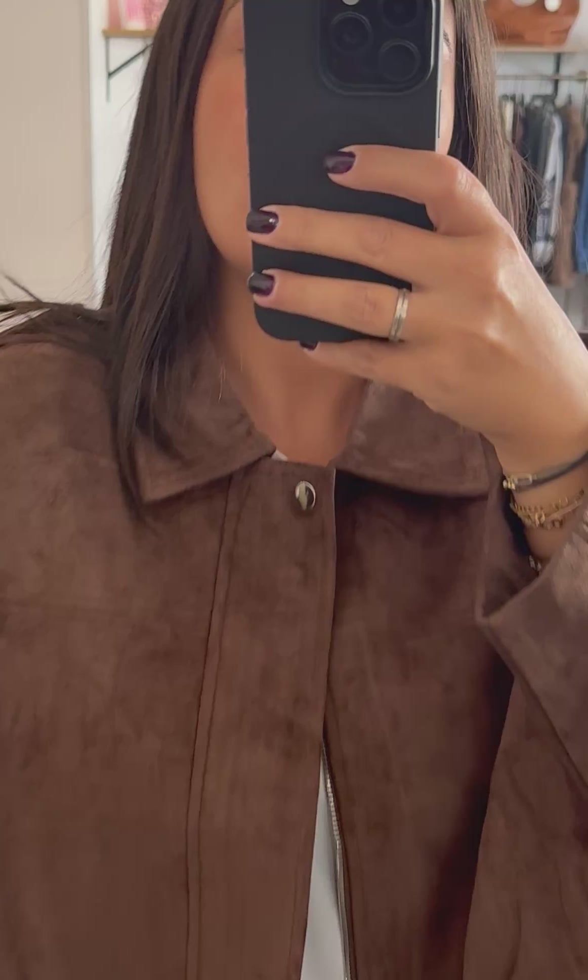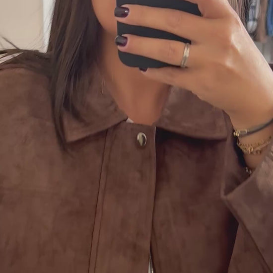 Blouson bomber effet suédine marron, coupe oversize avec épaules structurées et fermeture zippée.